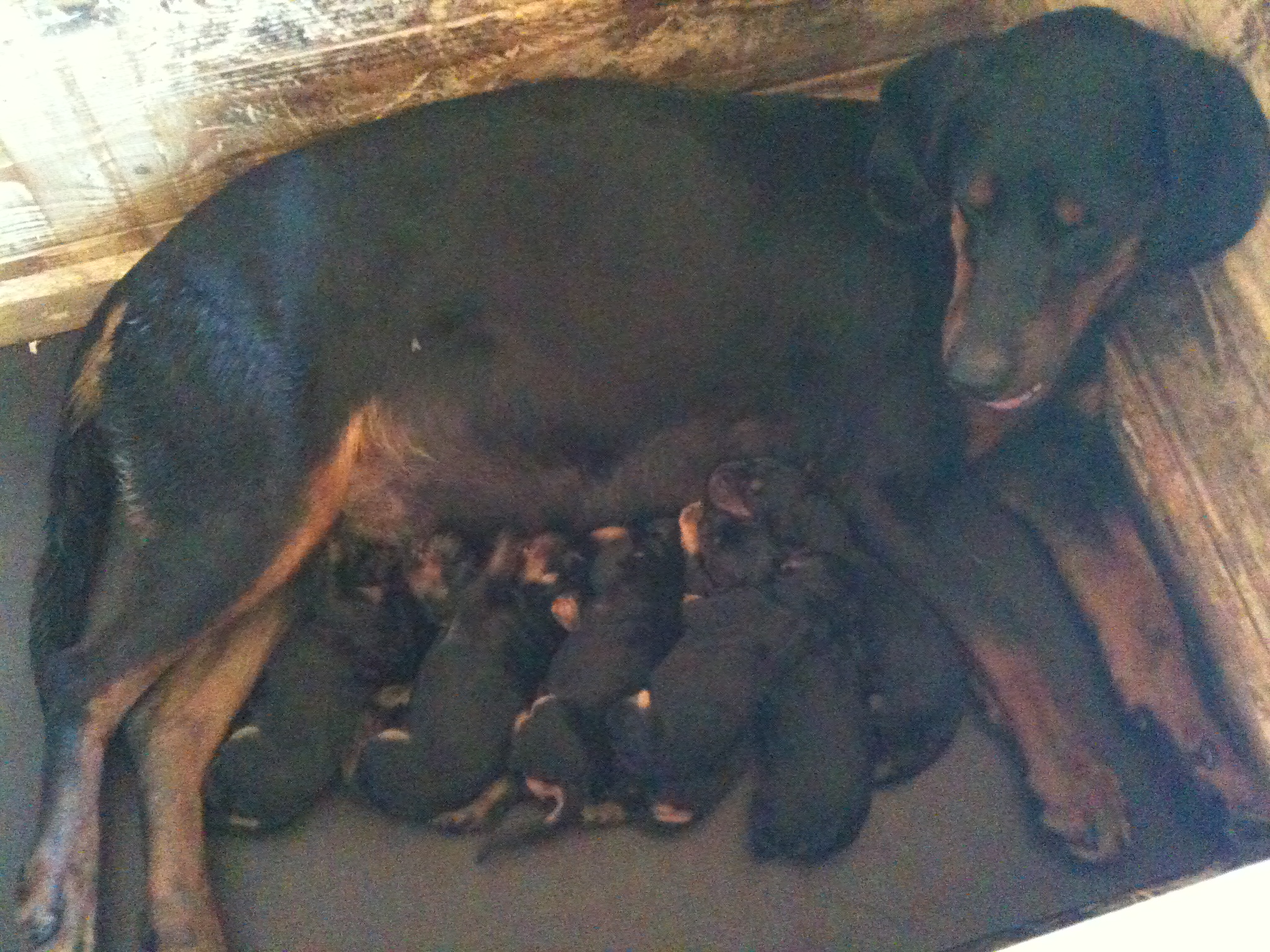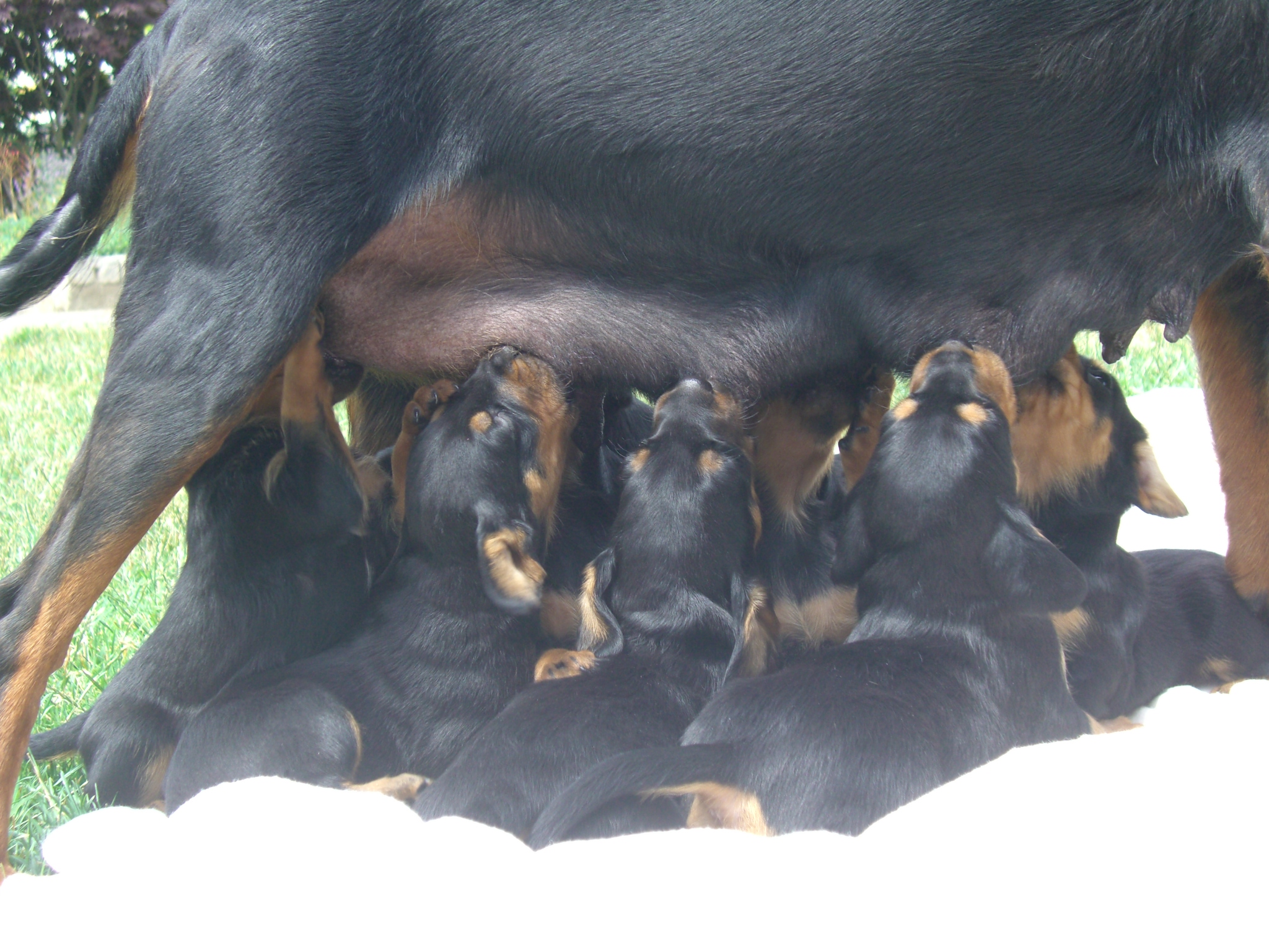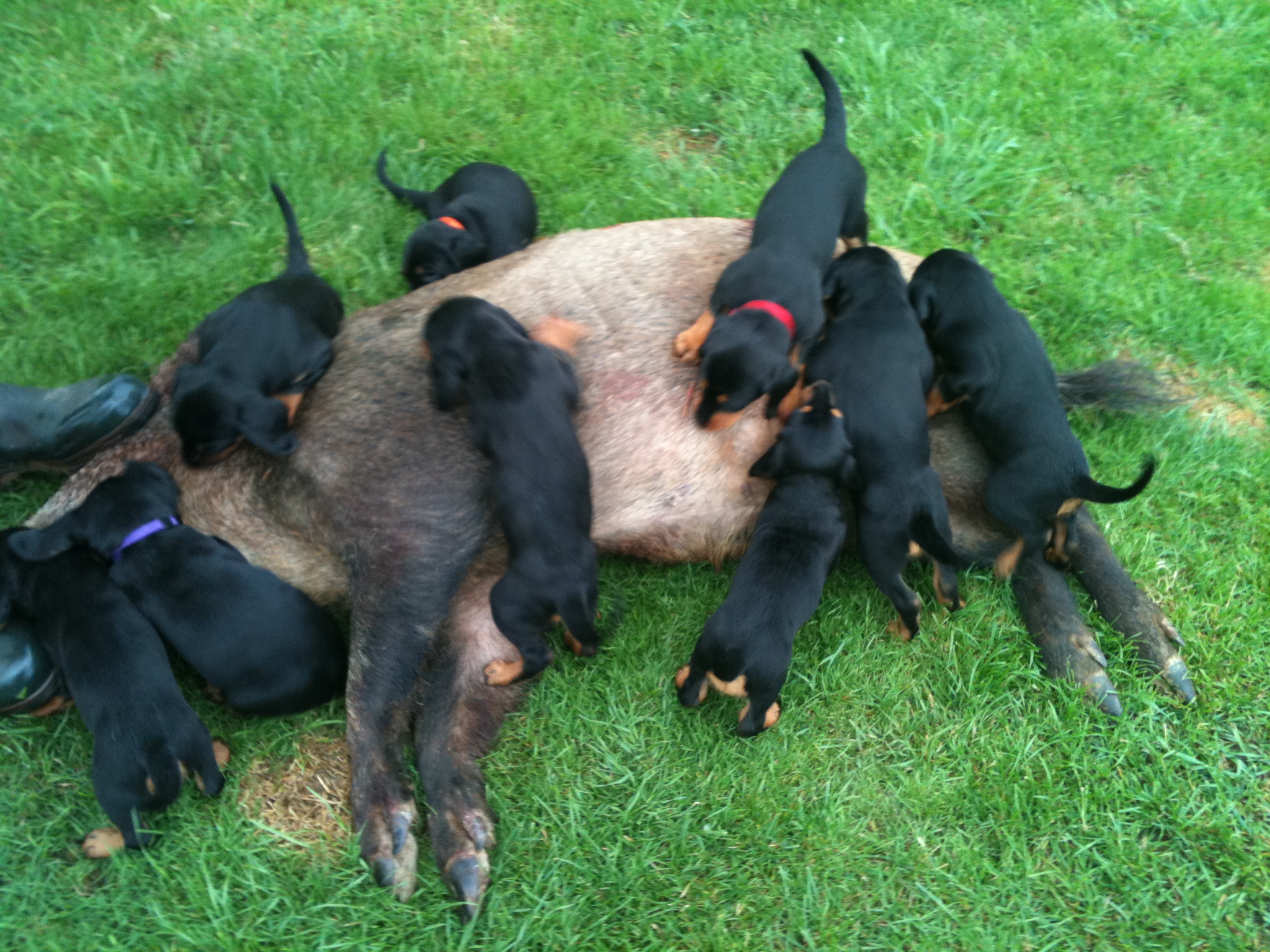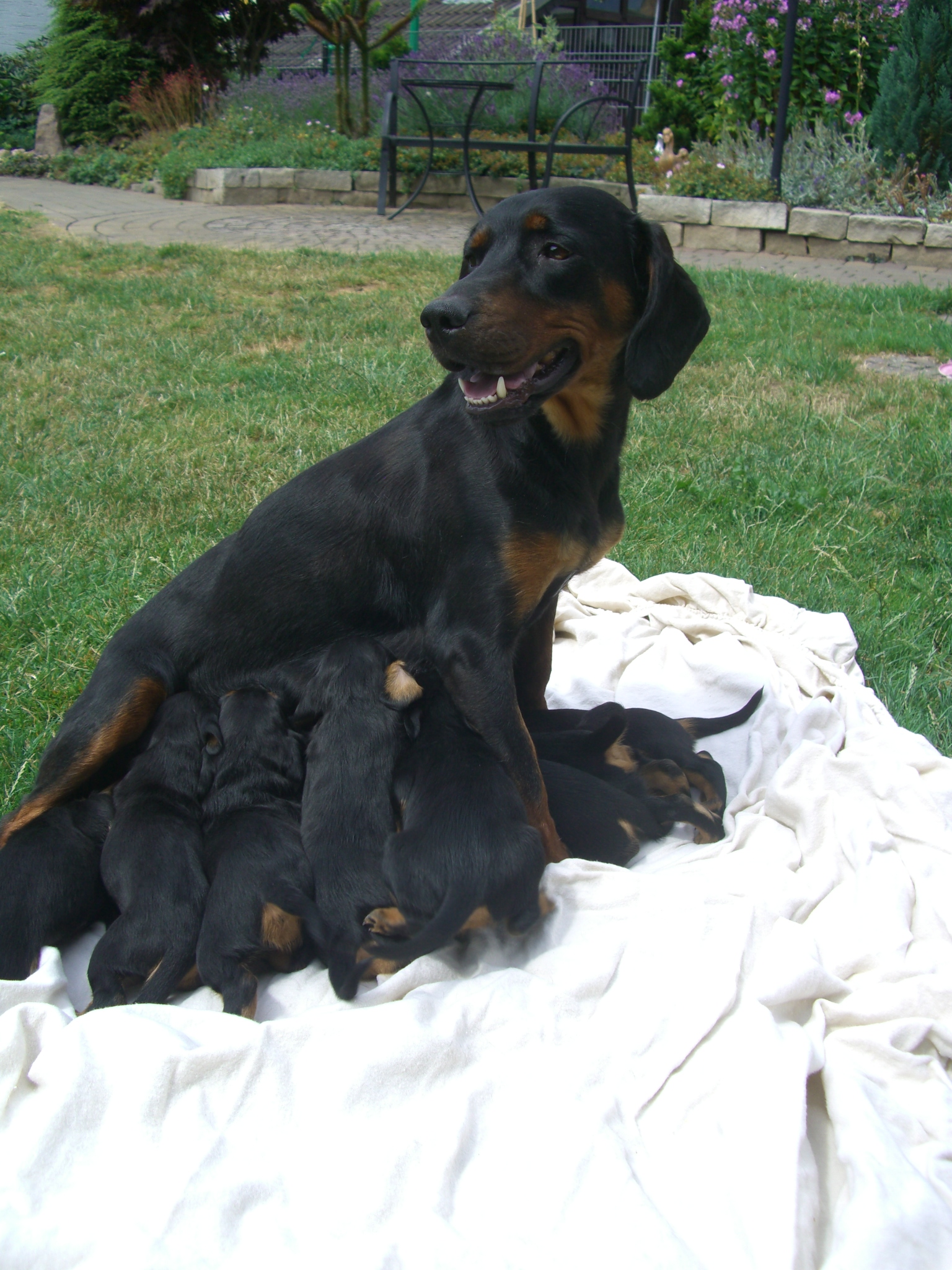 Am 8.7.2010 erblickten neun gesunde Slovensky Kopovwelpen (4,5) das Licht der Welt. Unsere Cora meistert ihre Aufgabe zum ersten Mal Mutter zu sein hervorragend - eine Mischung aus liebevoll und wachsam.